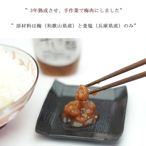 添加物は一切くわえずに三年熟成させ、手作業で種をとり梅肉にしました。
